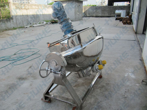 惠合機(jī)械生產(chǎn)的可傾式夾層鍋是以沖壓、旋壓一次成型無焊接的,其中鍋體可作180度以內(nèi)的旋動,圖中設(shè)備是以敞口式濃縮的