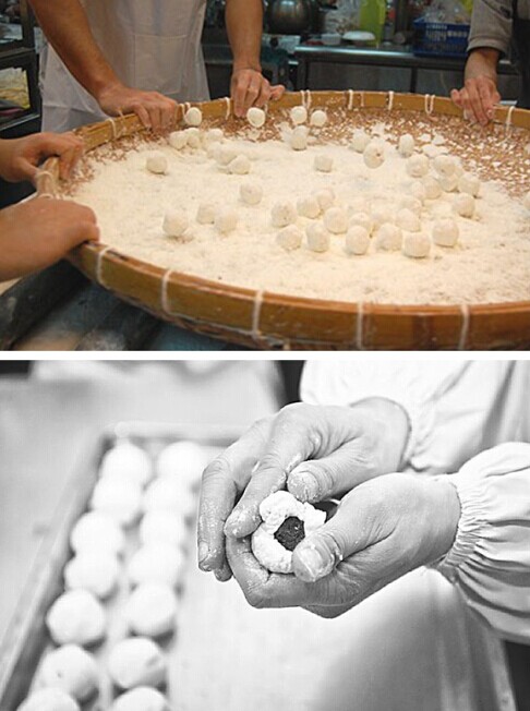 制作元宵時(shí),先把餡料(多使用桂華、白糖、蜜餞)捏成均勻的小球狀,放在鋪有干糯米粉的蘿筐里不斷搖晃,不時(shí)加入清水使餡料粘上越來(lái)越多的糯米粉,直至大小適中。