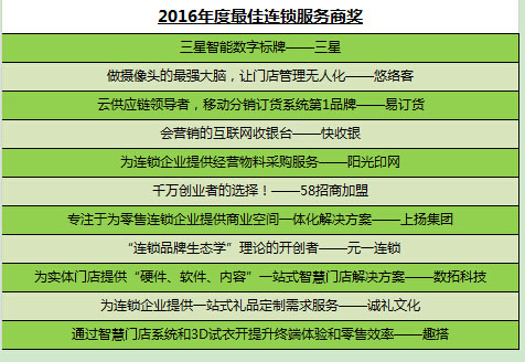 本次峰會現(xiàn)場的頒獎環(huán)節(jié)更為引人矚目。以名創(chuàng)優(yōu)品、西貝、漢堡王、海底撈、百果園等為代表的全國,乃至全球的知名品牌商榮登“2016年度中國高成長連鎖50強”榜單;“2016年度更具潛力連鎖之星”則分別被望湘園、永和豆?jié){、新加坡媽媽烤包、喜來快遞、大腦地圖等優(yōu)質(zhì)連鎖企業(yè)奪得;開心麗果、漢堡王、名創(chuàng)優(yōu)品、麥多、皇家雞排等則獲得“2016年十大更值得加盟連鎖品牌”;而“2016年十大更受消費者喜愛門店”則“花落”鯊魚先生博物館、木屋燒烤、cityzoo、popmart、精悅蓉牛蛙等商家;好享家、新發(fā)則、凱蘭帝等為代表的連鎖行業(yè)“新勢力”毫無疑問地拿到了“2016年度商業(yè)模式創(chuàng)新獎”。