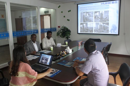 牛奶生產(chǎn)線設(shè)備,來我公司參觀并與銷售人員進(jìn)行具體細(xì)節(jié)的洽談。